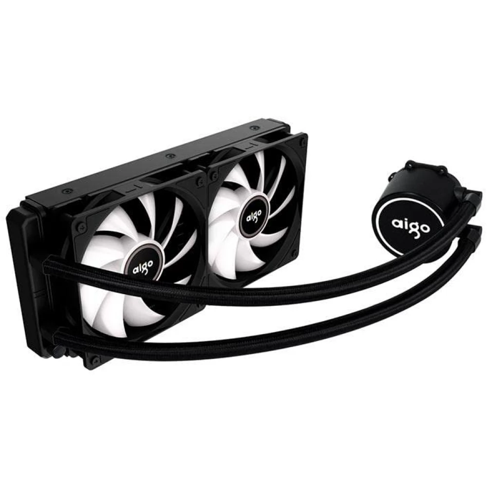 Kompakte, universelle Wasserkühlung mit 2 120-mm-Lüftern mit Rainbow-LED-Beleuchtung (nicht steuerbar) und PWM-Geschwindigkeitsregelung, 240-mm-Radiator und CPU-Wasserkühlungsblock ebenfalls mit Rainbow-LED-Beleuchtung (nicht steuerbar).
