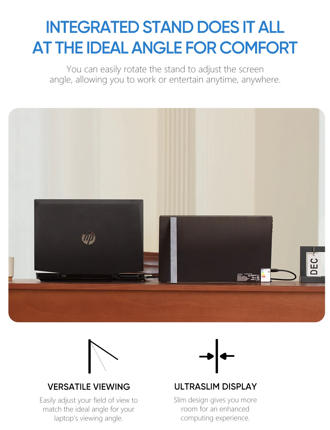 Der Monitor verfügt über eine 14-Zoll-Full-HD-Auflösung (1920 x 1080), die sich perfekt zum Arbeiten mit Text und zum Ansehen von Videos eignet. Die IPS-Technologie (In-Plane Switching) sorgt für eine realistische Darstellung präziser und lebendiger Farben und dank des Betrachtungswinkels von 178/178 Grad sind Bilder aus nahezu jedem Winkel gut sichtbar, auch bei seitlicher Betrachtung. Der Monitor kann je nach Bedarf gedreht werden.