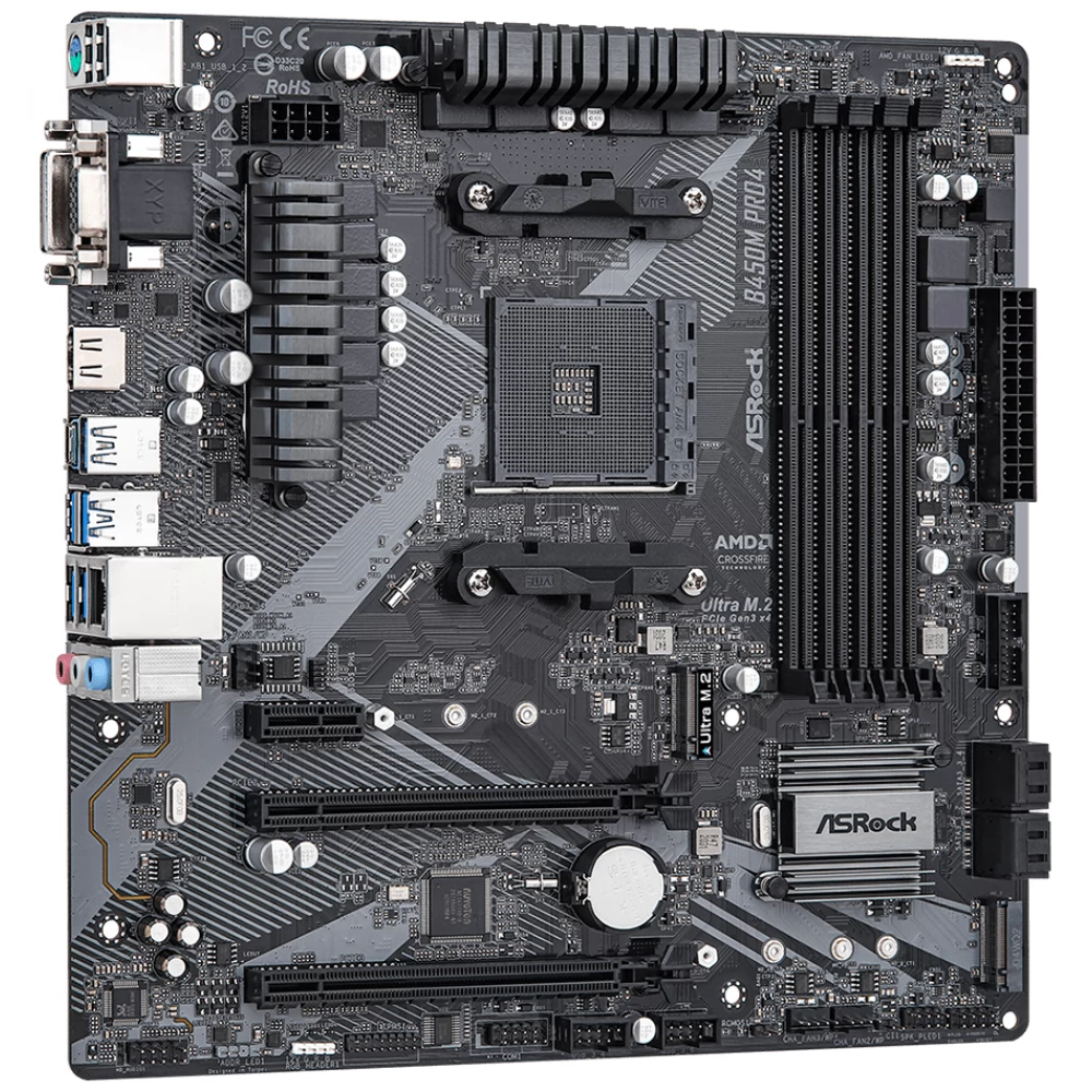Das ASROCK B450M Pro4 R2.0-Motherboard basiert auf dem AMD B450-Chipsatz, der die beliebten Ryzen-Prozessoren stabil unterstützt. Dieses Motherboard im Micro-ATX-Format ist die ideale Wahl für alle, die ein kostengünstiges, aber dennoch zuverlässiges und vielseitiges System aufbauen möchten, sei es für den Heim- oder Bürogebrauch oder leichtes Gaming. Das Board unterstützt Prozessoren der Serien AMD Ryzen 2000, 3000, 4000 G, 5000 und 5000 G und bietet Benutzern die Flexibilität, ihr System anzupassen und weiterzuentwickeln.