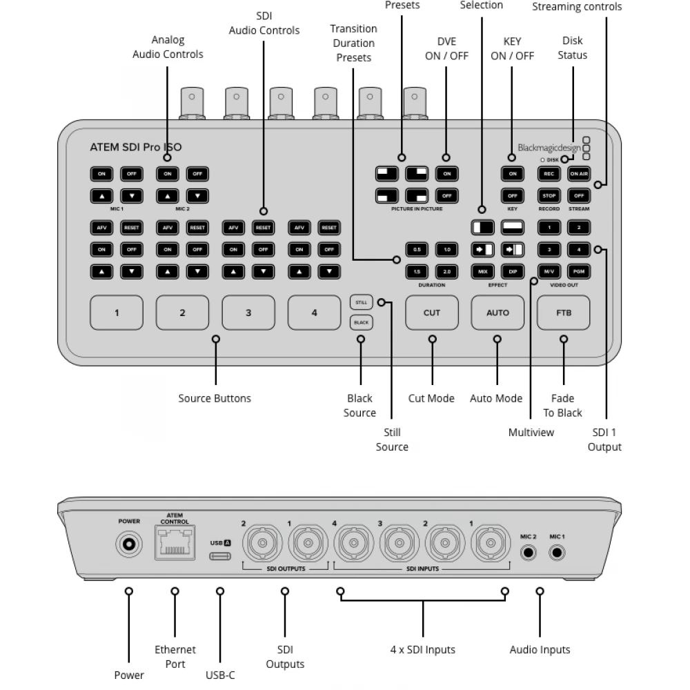 Atem SDI Pro ISO ist ein benutzerfreundlicher SDI-Mixer, der sich ideal zum Erstellen von Streams eignet. Im Vergleich zur einfachen Version können Sie mit der Pro ISO-Version bis zu 5 Videos in Echtzeit streamen und aufzeichnen.