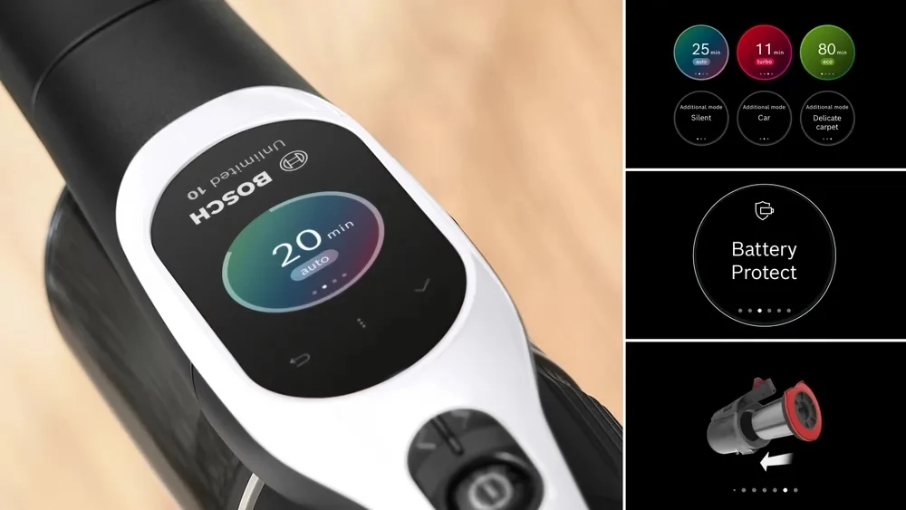 Das Unlimited 10-Gerät lässt sich vollständig über das smarte TFT-Bedienfeld steuern. Das Display zeigt die verbleibende Betriebszeit an und ermöglicht den einfachen Wechsel zwischen den 6 Reinigungsmodi. Sehen Sie sich Anleitungen direkt auf dem Gerät an oder öffnen Sie das Smart User Guide über das Display. Sie können die Lebensdauer Ihres Akkus mit der Option „Batterieschutz“ verlängern und durch die Aktivierung des Energiesparmodus eine längere Betriebszeit genießen.