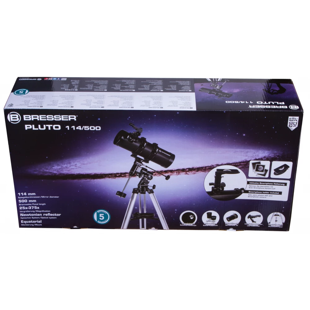 Das kleine Reflektorteleskop Bresser Pluto 114/500 ist die perfekte Wahl für Reisende; Sie können es problemlos überall hin mitnehmen. Sowohl Anfängerastronomen als auch erfahrene Entdecker können mit diesem optischen Gerät arbeiten. Trotz seiner geringen Größe verfügt der Bresser Pluto 114/500 über hochwertige optische Elemente und liefert ein hochwertiges Bild. Darüber hinaus verfügt dieses Teleskop über einen großen Spiegel für ein weites Sichtfeld.