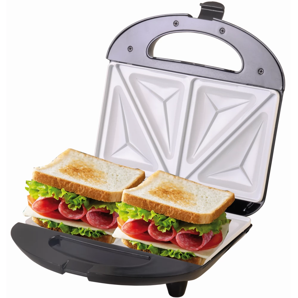 Sandwichofen mit einer Leistung von 700 W, es können bis zu 2 Sandwiches gleichzeitig zubereitet werden, die am Ende des Garvorgangs in 4 3-Eck-Sandwiches aufgeteilt werden können. Das Backblech ist mit einer Keramikbeschichtung versehen, die ein Anhaften von Speisen verhindert.