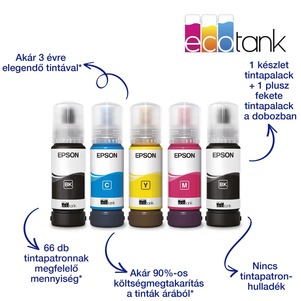Mit diesem sparsamen Drucker können Sie bis zu 90 % Ihrer Druckkosten einsparen, außerdem liefern wir ausreichend Tinte für bis zu 3 Jahre mit. Mit der mitgelieferten Tinte ist es möglich, bis zu 8.100 Schwarzweiß- und 6.500 Farbseiten zu drucken, und die Ersatztintenflaschen bieten Platz für bis zu 66 Tintenpatronen.