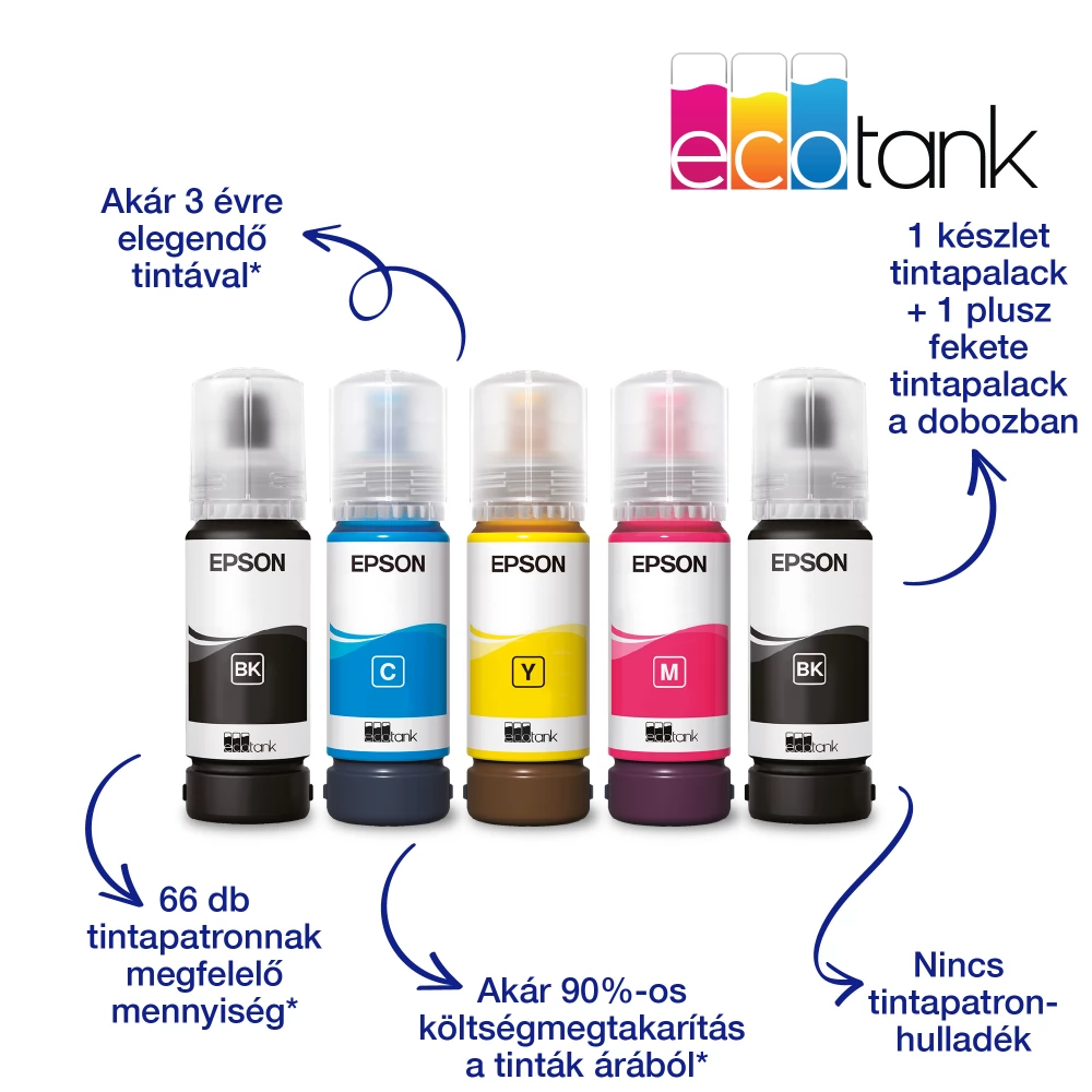 Mit diesem sparsamen Drucker können Sie bis zu 90 % Ihrer Druckkosten einsparen, außerdem liefern wir ausreichend Tinte für bis zu 3 Jahre mit. Mit der mitgelieferten Tinte ist es möglich, bis zu 8.100 Schwarzweiß- und 6.500 Farbseiten zu drucken, und die Ersatztintenflaschen bieten Platz für bis zu 66 Tintenpatronen.