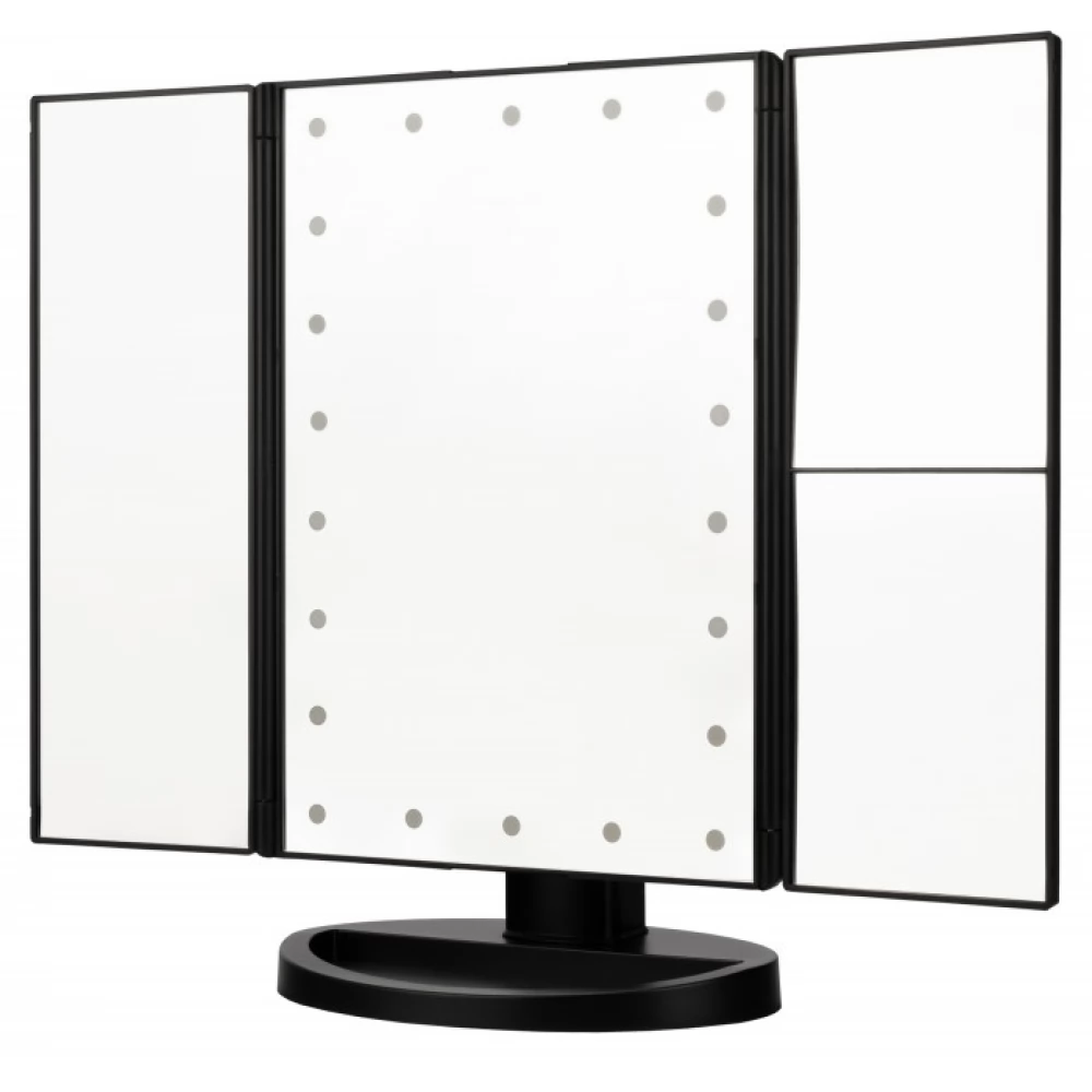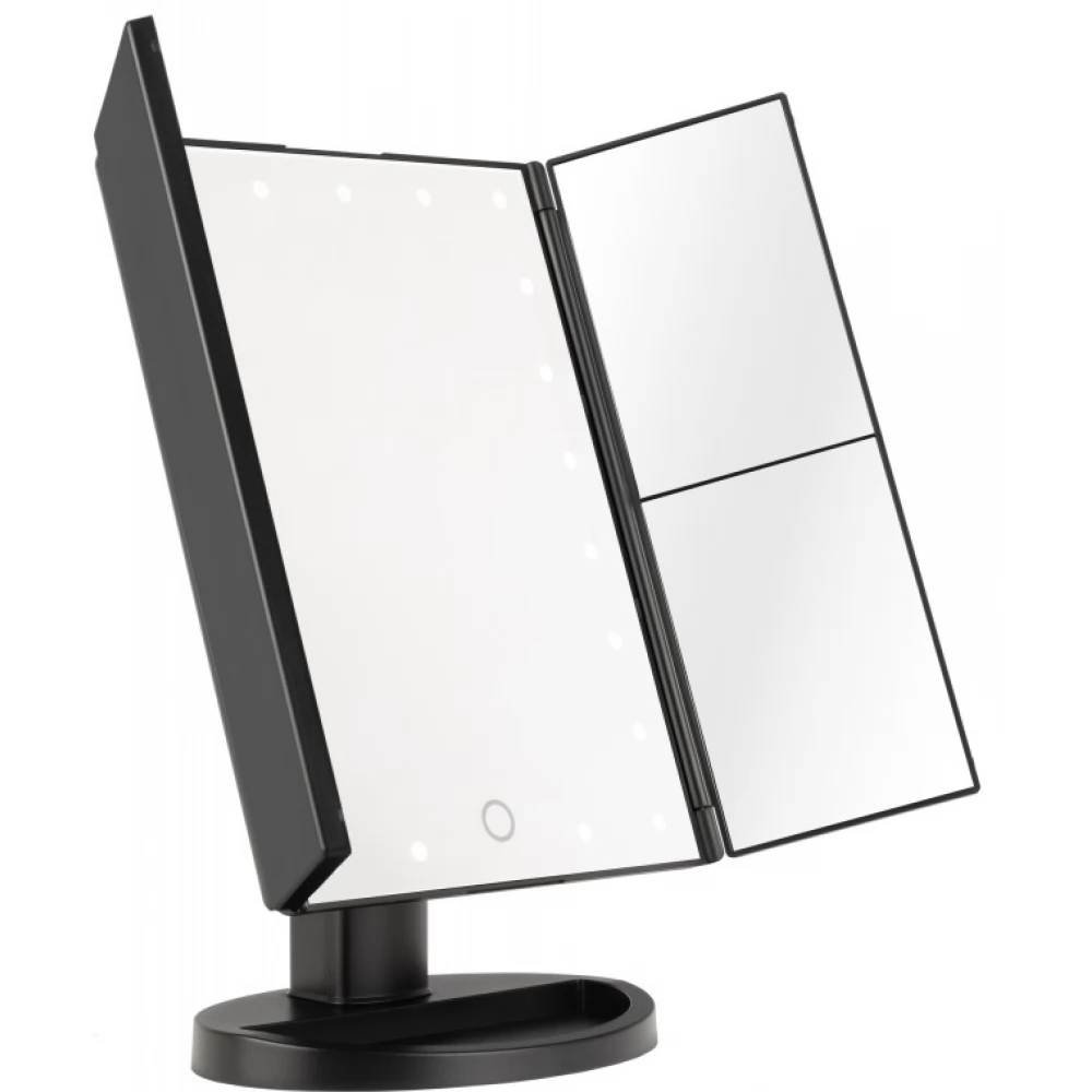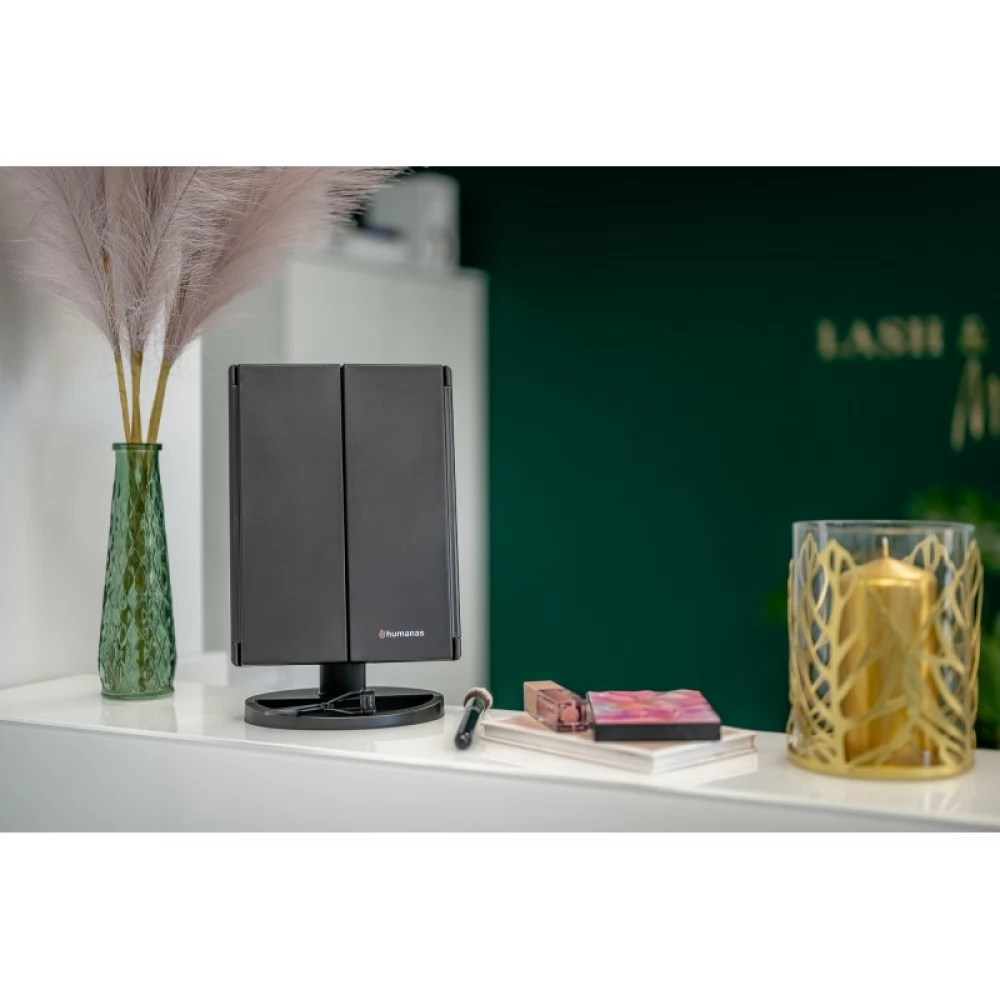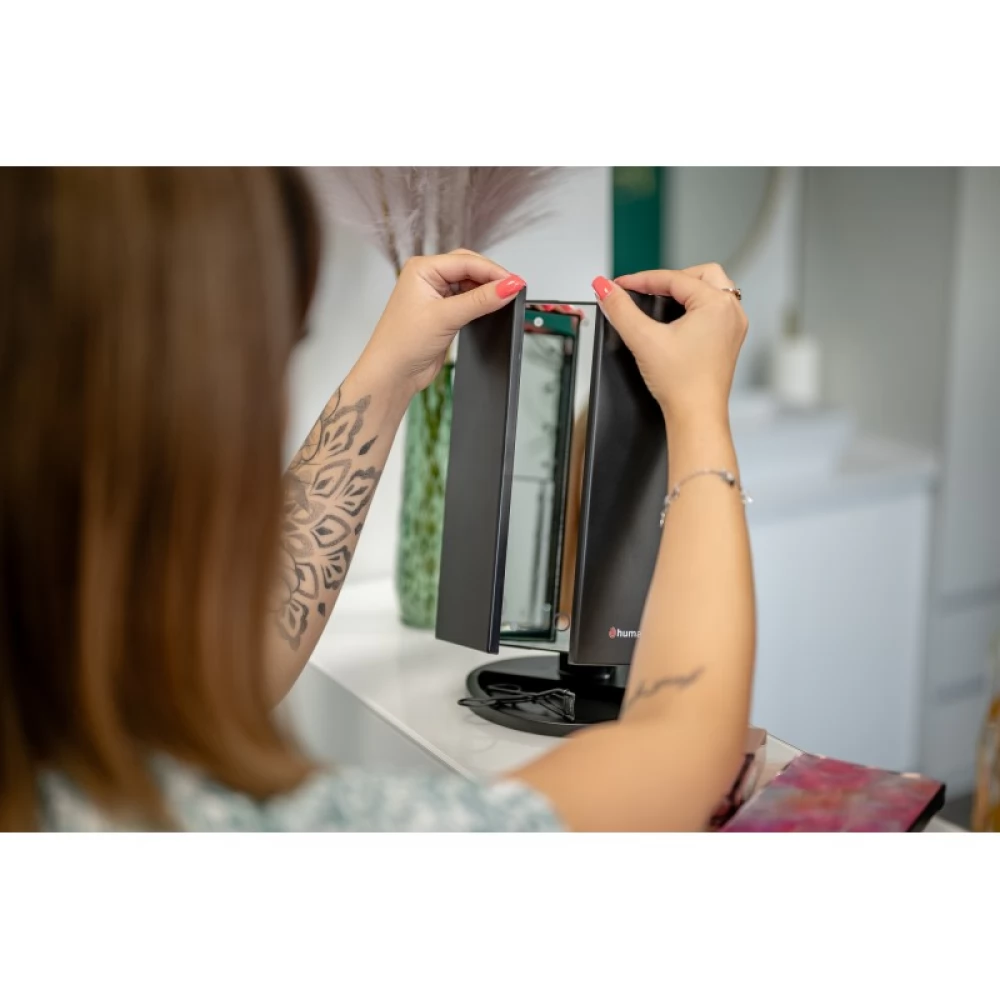 Der Schminkspiegel Humanas HS-ML04 ist die perfekte Kombination aus Stil und Funktionalität. Sie sorgt für eine perfekte Ausleuchtung des Gesichts und macht die tägliche Pflege zum Vergnügen. Mit Hilfe eines in die Oberfläche des Spiegels integrierten Touch-Buttons können Sie die Helligkeit ganz einfach an Ihre aktuellen Bedürfnisse anpassen. Die Stromversorgung des Geräts kann über ein Netzteil, einen Computer oder ein Ladegerät mit AAA-Batterien oder das mitgelieferte USB-Kabel erfolgen. Durch das schnelle und bequeme Aufklappen sparen Sie Platz auf Ihrem Schreibtisch oder Schminktisch. Die um 180° neigbaren Module sorgen für noch mehr Freiheit beim Schminken. Dank der zusätzlichen Vergrößerungsspiegel haben Sie die volle Kontrolle über jedes Detail Ihres Make-ups.