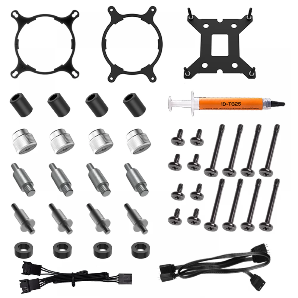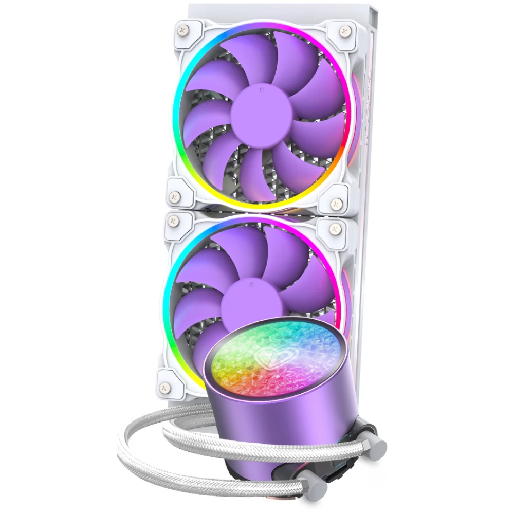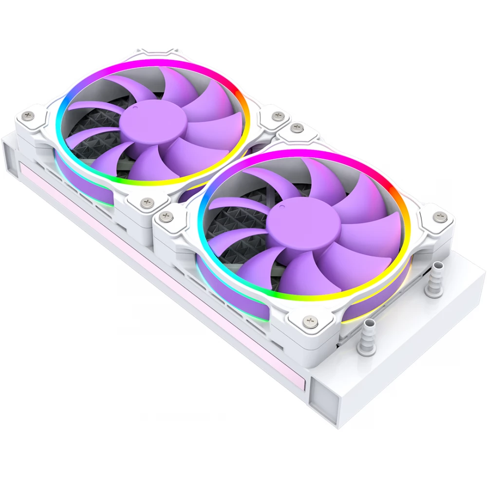 Kompakte, universelle Wasserkühlung mit 2 steuerbaren 120-mm-Ringlüftern mit ARGB-Beleuchtung und PWM-Geschwindigkeitsregelung bis zu 250 W TDP.
