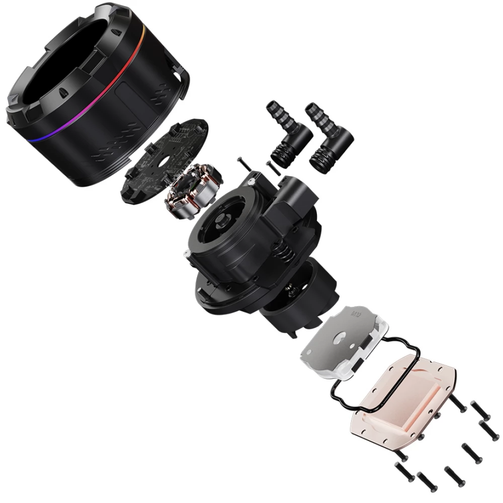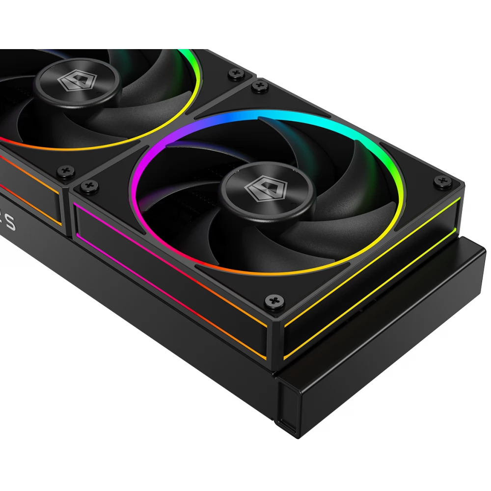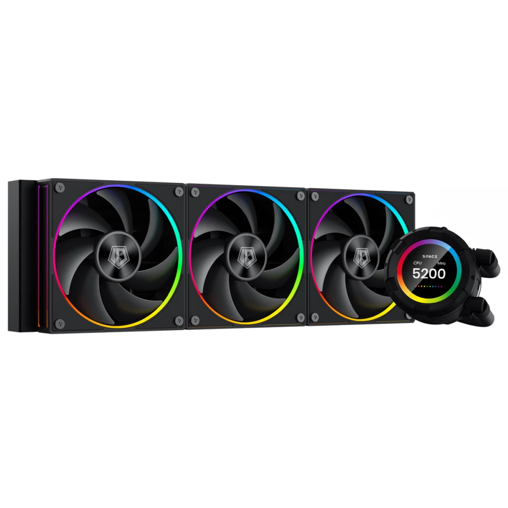 Kompakte, universelle Wasserkühlung mit 3 steuerbaren Ring-/Rahmenlüftern mit ARGB-Beleuchtung, 360-mm-Radiator und CPU-Wasserkühlungsblock ausgestattet mit einem 2,1-Zoll-LCD-Display. Auf dem Display können verschiedene Systeminformationen, Bilder und Animationen angezeigt werden.