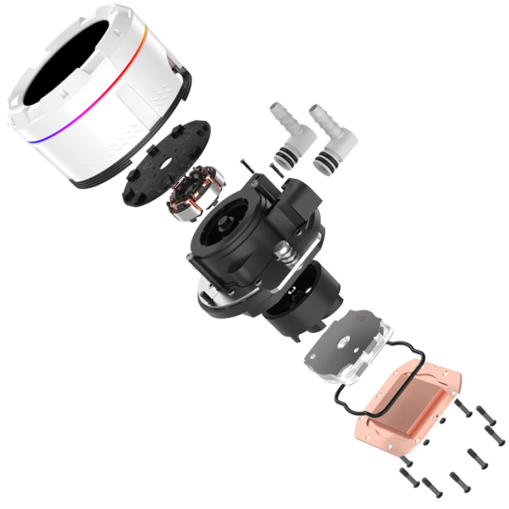 Kompakte, universelle Wasserkühlung mit 3 steuerbaren Ring-/Rahmenlüftern mit ARGB-Beleuchtung, 360-mm-Radiator und CPU-Wasserkühlungsblock ausgestattet mit einem 2,1-Zoll-LCD-Display. Auf dem Display können verschiedene Systeminformationen, Bilder und Animationen angezeigt werden.