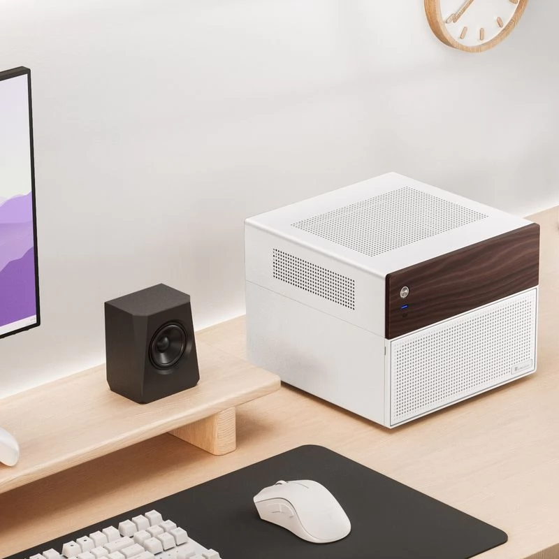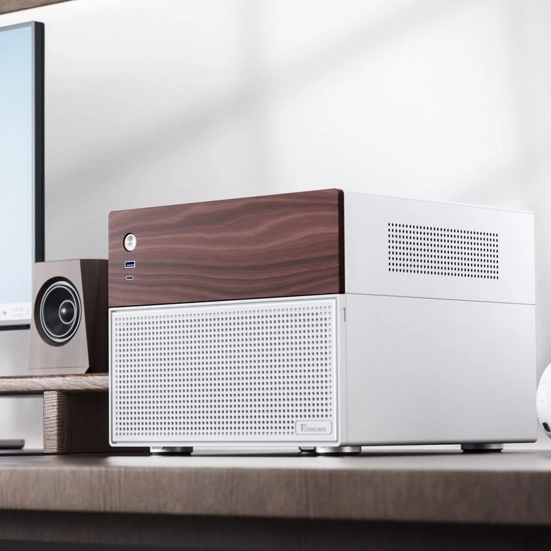 Jonsbo N4 ist ein würfelförmiges Micro-ATX-Gehäuse für DIY-NAS-Server. Das NAS-Gehäuse verfügt über ein elegantes Design, inklusive einer eleganten Zierleiste aus dunklem Walnussholz, was es noch attraktiver macht.