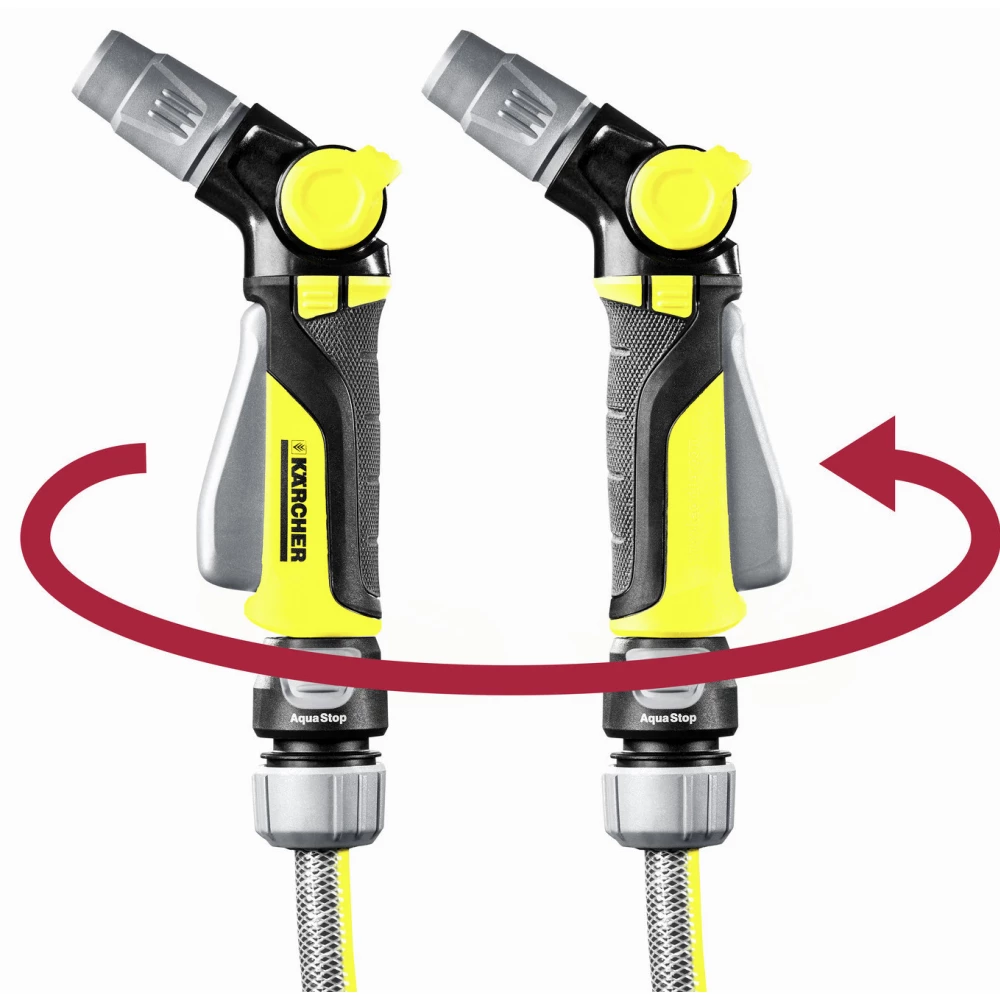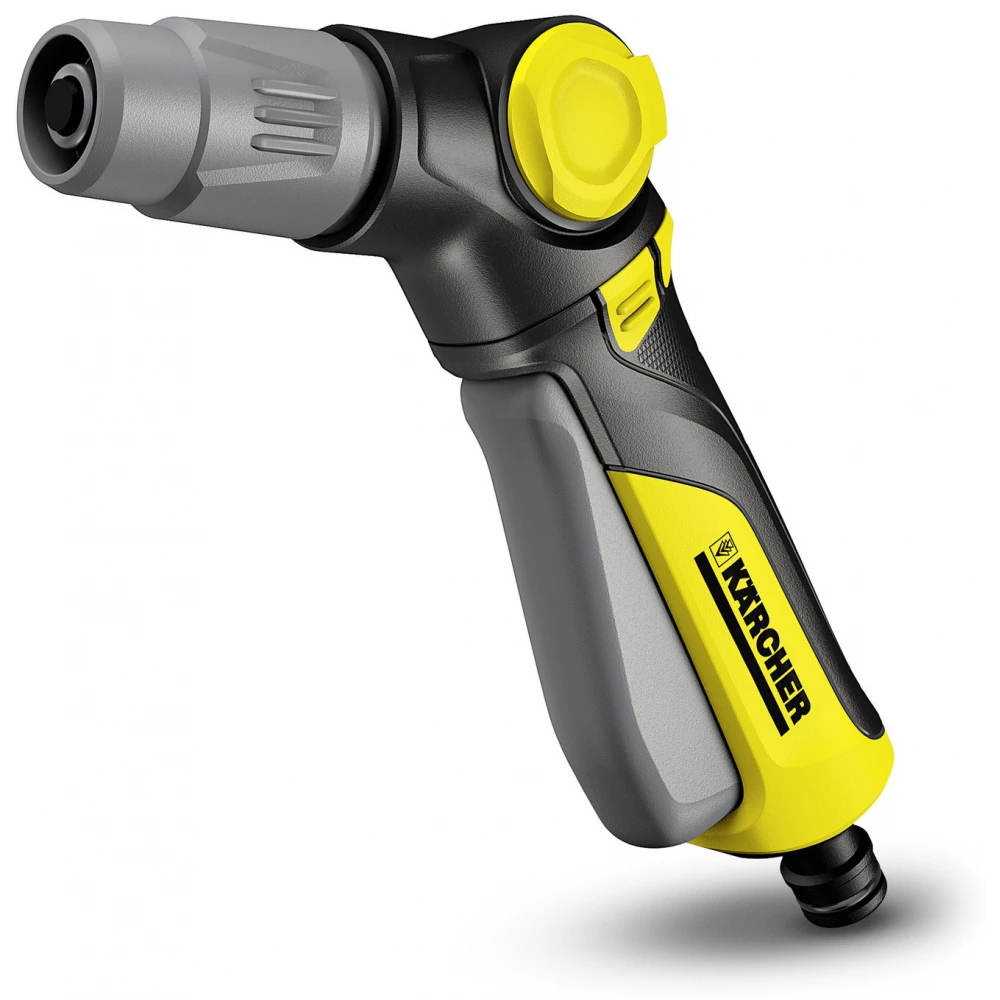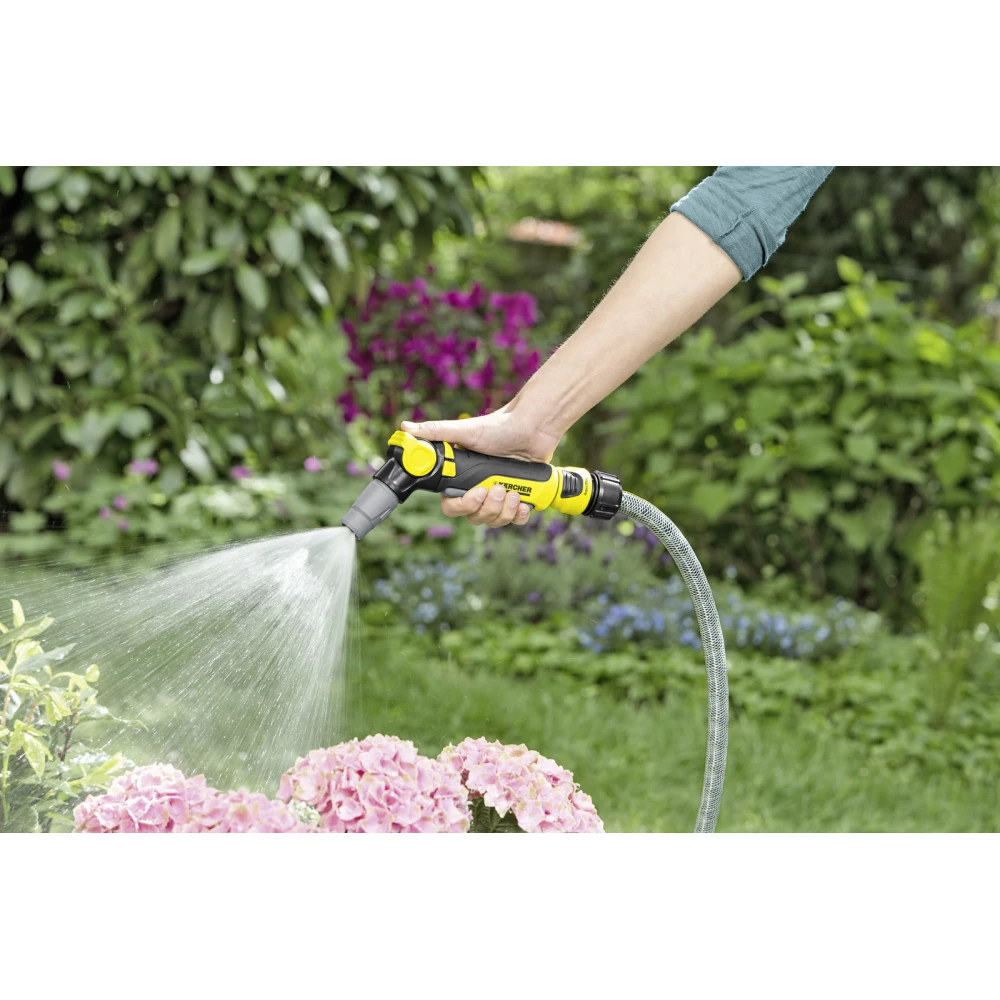 Diesen Komfort bietet nur Kärcher. Bei der Handspritzpistole ermöglicht der drehbare Griff einen individuellen Handhabungskomfort, mit dem der arretierbare Abzug nach vorne oder hinten gedrückt werden kann. Darüber hinaus besteht es aus angenehm anzufassenden, weichen Kunststoffelementen, die für zusätzlichen Schutz sorgen. Mit dem einhändig bedienbaren Regelventil lässt sich die Wassermenge je nach Bedarf regulieren. Die Spritzpistole verfügt über zwei Spritzmuster: Punkt und Kegel. Diese lassen sich je nach Bedarf stufenlos verstellen, beispielsweise um Blumen- und Pflanzenbeete zu bewässern oder den Großteil des Schmutzes von Terrassen und Gartenmöbeln zu entfernen. Übrigens können die Kärcher Sprühköpfe mit jedem verfügbaren Anschlusssystem problemlos an den Gartenschlauch angeschlossen werden.