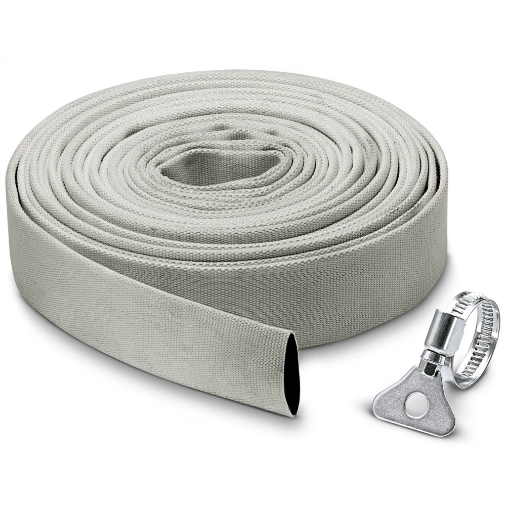 Flexibler Gewebeschlauch mit Edelstahl-Schlauchklemme (30-40 mm) mit Flügelschraube für werkzeuglosen Anschluss. Es empfiehlt sich besonders für Tauchpumpen beim Transport großer Wassermengen.