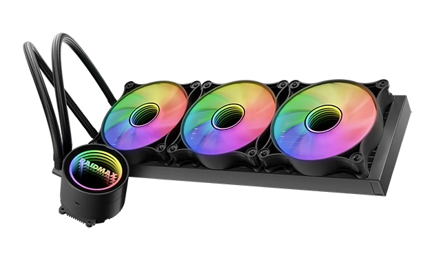 Kompakte, universelle Wasserkühlung mit 3 120-mm-Lüftern mit PWM-Regulierung, steuerbarer ARGB-Beleuchtung, einem 360-mm-Radiator und einem CPU-Wasserkühlungsblock, der auch über steuerbare ARGB-Beleuchtung verfügt. Darüber hinaus haben die Lüfter und der CPU-Kühlblock einen spektakulären ringartigen Infinity-Spiegel-Lichteffekt erhalten.