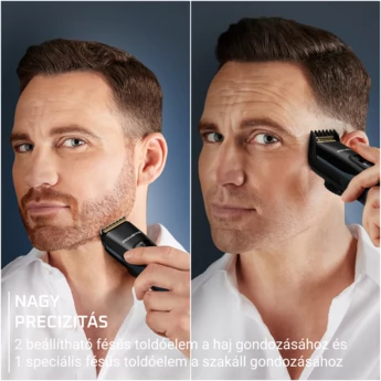 Zwei verstellbare Kammverlängerungen, die 29 Schnittlängen (0,5–30 mm) mit einer Einstellgenauigkeit von 1 mm für präzises Styling und eine Bartpflegebürste bieten.