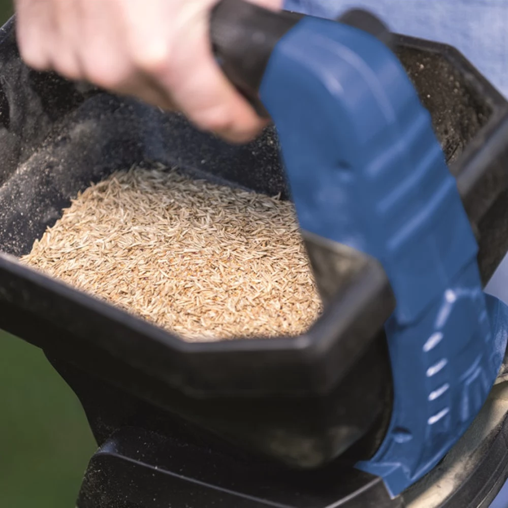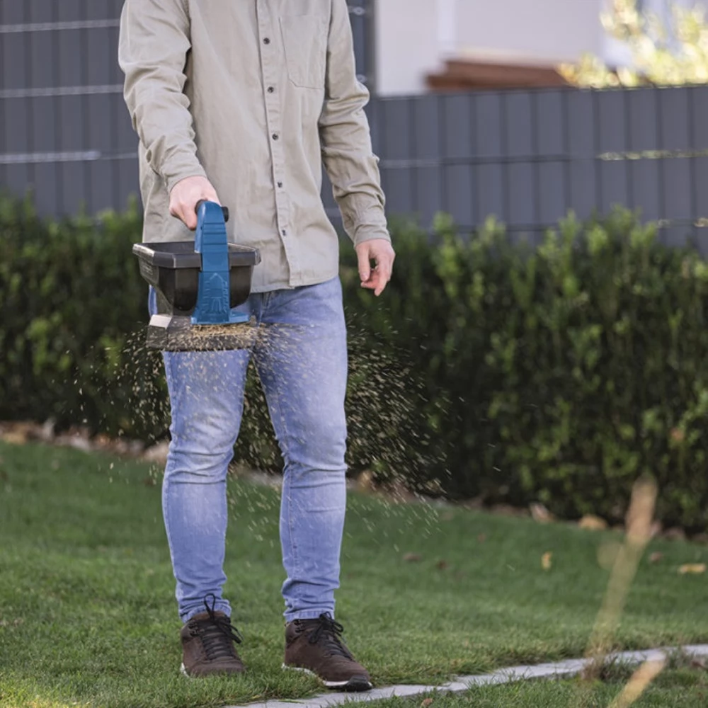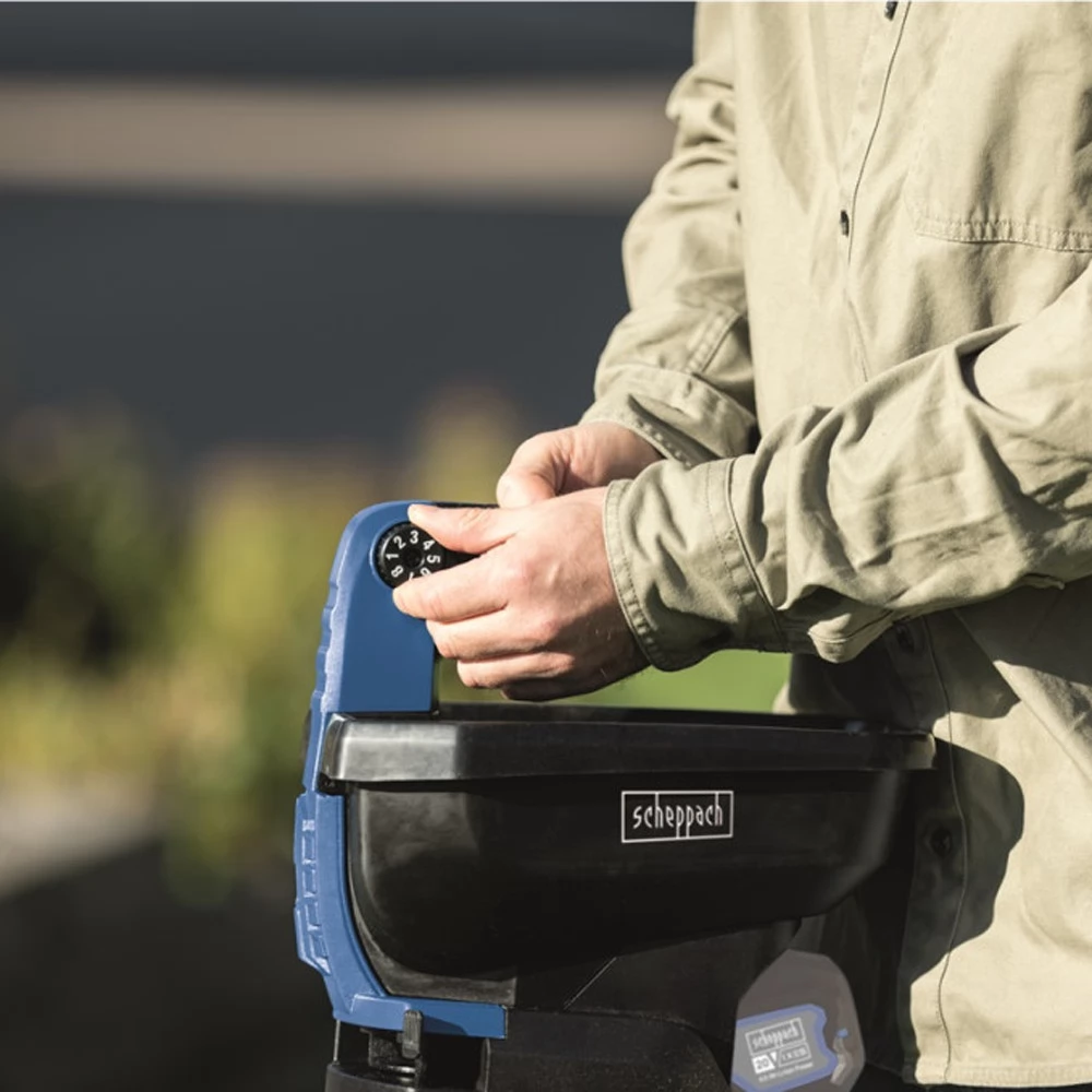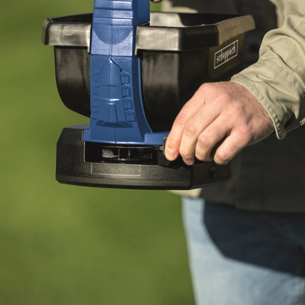 Das Spray bietet eine gleichmäßige Verteilung des Materials an verschiedenen Oberflächenarten, sei es Gras, Schnee oder Boden. Mit dem großen 3,5-Liter-Tank können Sie bis zu 800 m² pro Ladung sprühen. Die zu verstreute Menge an Material kann in 8 Grade eingestellt werden.