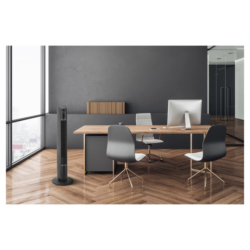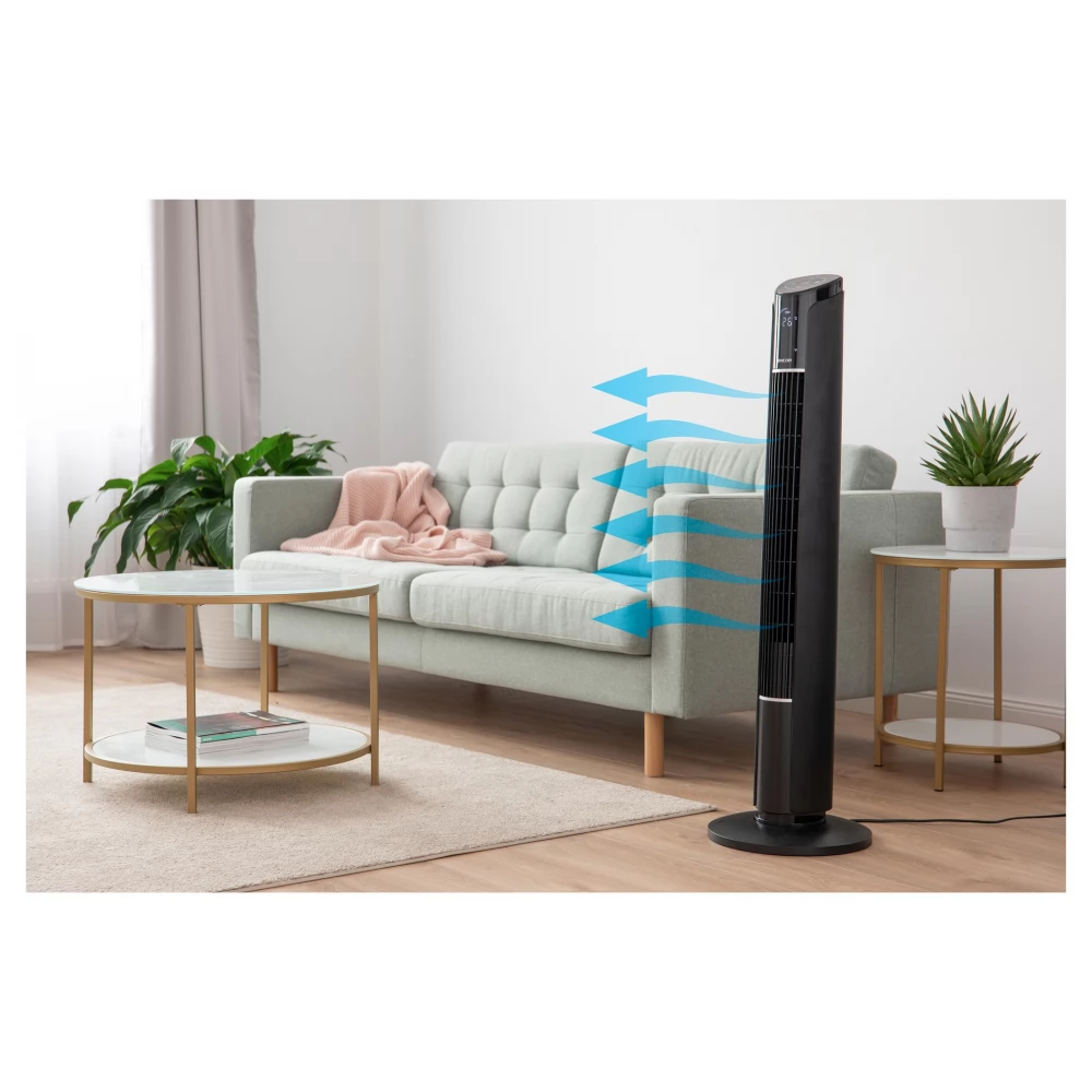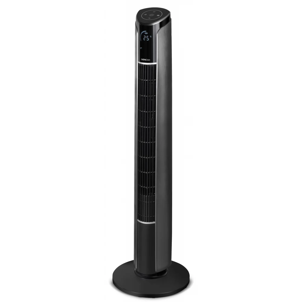 Der leise und intelligente Säulenventilator Sencor SFT 4207BK wird nicht nur an heißen Sommertagen Ihr Helfer sein. Das unauffällige Design des Ventilators überrascht den Anwender durch seine Laufruhe und Platzersparnis. Der maximale Geräuschpegel liegt bei 58 dB, so dass er weder tagsüber noch nachts störend wirkt. Es verfügt außerdem über eine Timerfunktion, die von 1 bis 12 Stunden eingestellt werden kann. Nach der gewünschten Betriebszeit schaltet sich der Ventilator automatisch ab. Zu den Geräten, die über WLAN gesteuert werden können, gehört die Sencor HOME-Anwendung. Außerdem finden Sie im oberen Teil ein Touchscreen-Bedienfeld und an der Vorderseite des Ventilators eine LED-Anzeige, auf der Sie die aktuelle Temperatur des Raumes überprüfen können. Zudem lässt es sich bequem mit der im Lieferumfang enthaltenen Fernbedienung steuern. Der Ventilator verfügt über 3 Geschwindigkeitsstufen und 4 voreingestellte Programme. Ein großer Vorteil ist die Variabilität der Lüftereinstellungen. Es bietet horizontale Oszillation und vertikale Neigung in zwei Winkeln. So können Sie den Luftstrom ganz an Ihre Bedürfnisse anpassen.