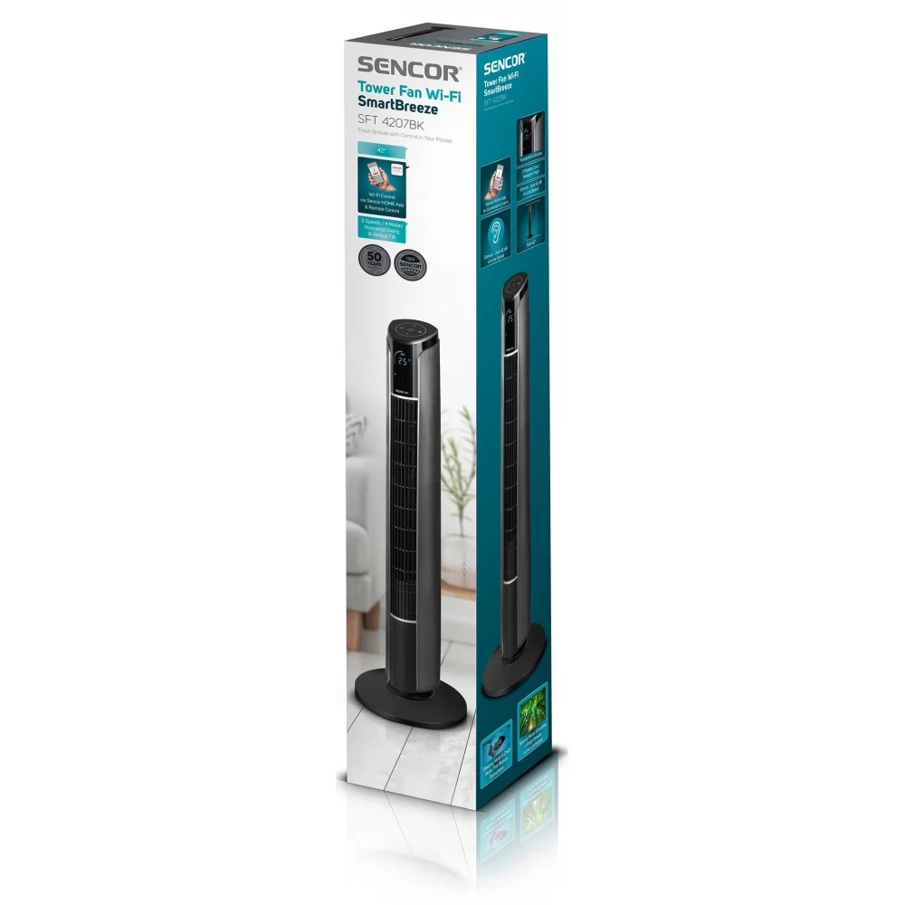 Der Sencor SFT4207BK Säulenventilator gehört zur Sencor-Smart-Device-Familie. Es kann über WLAN in der Sencor HOME-Anwendung gesteuert werden. Die Installation ist sehr einfach. Sie können die App und diesen Ventilatortyp über den QR-Code in der Anleitung herunterladen. Die Anwendung ist für den Benutzer intuitiv und übersichtlich und ermöglicht auch die Fernsteuerung des Geräts. Genießen Sie jederzeit angenehm erfrischende Luft im Raum.