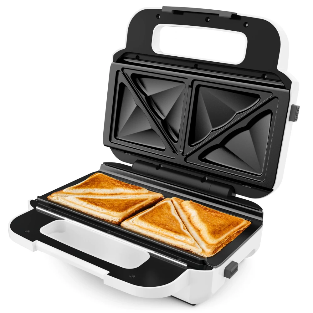 Das Gerät verfügt über zwei herausnehmbare Backbleche: Auf einem können Sie Sandwiches zubereiten, auf dem anderen können Sie große Waffeln backen – so bleibt genügend Platz für die Füllung.
